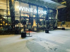 Bild på Wine & Dine längst hamnpromenaden medan det snöar.