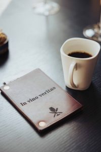 Bild på Wine & Dines vinmeny där det står "in vino veritas" vilket betyder "i vinet finns sanningen.