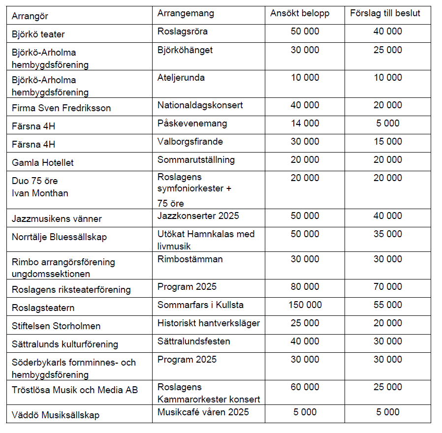 Utöver de förlängda verksamhetsavtalen beslutade nämnden också om årets största utdelning av programbidrag. Totalt delas 495 000 kronor ut till 18 olika evenemang som arrangeras under våren och sommaren i Norrtälje kommun.